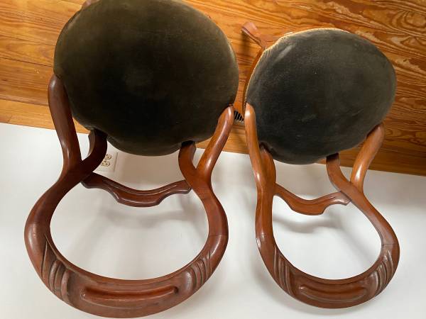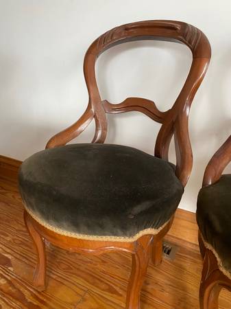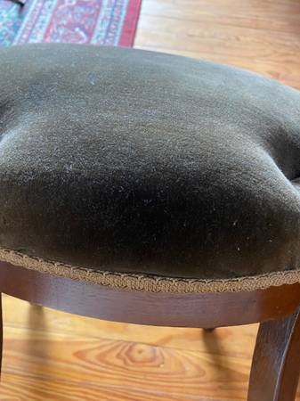 Dark green velvet seat. Nice lines. Beautiful detailed ribbing. Sold as a pair. Also, have wooden parts for a third chair.